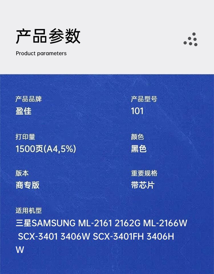 | 适用机型 | 三星SAMSUNG ML-2161 2162G ML-2166W SCX-3401 3406W SCX-3401FH 3406HW |