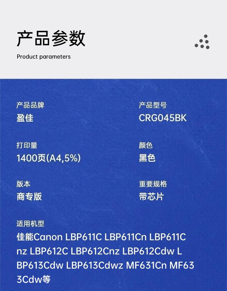 | 适用机型 | 佳能Canon LBP611C LBP611Cn LBP611Cnz LBP612C LBP612Cnz LBP612Cdw LBP613Cdw LBP613Cdwz MF631Cn MF633Cdw MF634Cdw MF632Cdw MF635Cx |